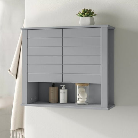 Maximize bathroom storage space with this chic Gray 2 Door Wall Mounted Bathroom Storage Cabinet. Perfect for storing toiletries, tissues, and extra hand towels, this cabinet features one open shelf and an interior adjustable shelf, customizing the shelf heights to your storage needs. This Gray 2 Door Wall Mounted Bathroom Storage Cabinet gives your main/guest bathroom or a style upgrade while freeing up your floor space. It's made from engineered wood in a neutral grey finish that complements any color palette you can dream up. It features crown molding at the top for a decorative touch, and its surface can easily hold candles and accent pieces. The open shelf below is ideal for washcloths and soap dispensers. And the slatted cabinet doors open up to reveal extra space for everything from towels to toilet paper. The cabinet comes with wall-mounting hardware to make installation a breeze.
