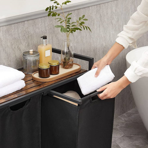 SKU: UBVA2011So many storage options that this Metal Wood Industrial Modern Laundry Sorter Hamper Black/Brown can offer you! 2 pockets made of Oxford fabric help you sort laundry by color, and a top shelf keeps detergent and fabric softener handy. Crafted of particleboard and steel, this laundry basket will stand steady and firm! The adjustable feet and anti-tip kits help prevent unwanted wobbles or accidental tipping.