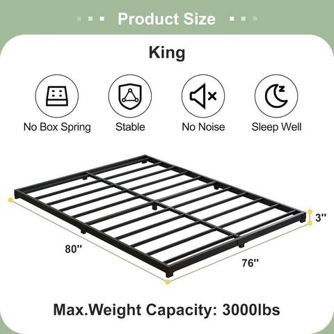 This King size 3-inch Low Profile Heavy Duty Metal Bed Frame in Matte Black is made of high-quality materials with reinforced legs that prevent structural deformation and support up to 3000 pounds. The versatile design of the King size bed frames provides a wide range of adaptability to accommodate any mattress type. It can replace the box spring as a way to save your budget. 3 inch King bed frames can be adapted to various heights of mattresses, so you can easily sit and rest on the bed. Installation can be done in just a few steps. All the tools needed are in the package. Simple and sturdy construction makes the bed frame twin noiseless and non-shaking. The Low profile King bed frame's lightweight design is suitable for a variety of rooms, making it easy to create the most of the available space. And the powder coated steel frame is easy to maintain.