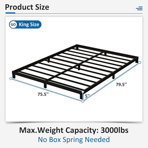 This King size 5-inch Heavy Duty Metal Bed Frame with 3,000 lb. Weight Capacity is made of high-quality materials with reinforced legs that prevent structural deformation and support up to 3000 pounds. The versatile design of the King size bed frames provides a wide range of adaptability to accommodate any mattress type. It can replace the box spring as a way to save your budget. 5 inch King bed frames can be adapted to various heights of mattresses, so you can easily sit and rest on the bed. Installation can be done in just a few steps. All the tools needed are in the package. Simple and sturdy construction makes the bed frame twin noiseless and non-shaking. The Low profile King bed frame's lightweight design is suitable for a variety of rooms, making it easy to create the most of the available space. And the powder coated steel frame is easy to maintain.