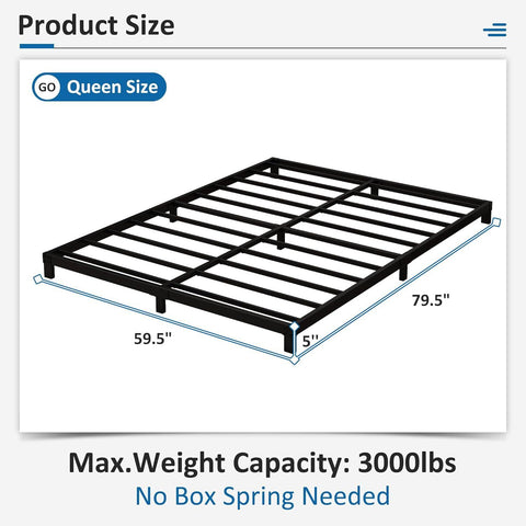 SKU: QFBFHD9632581This Queen size 5-inch Heavy Duty Metal Bed Frame with 3,000 lb. Weight Capacity is made of high-quality materials with reinforced legs that prevent structural deformation and support up to 3000 pounds. The versatile design of the Queen size bed frames provides a wide range of adaptability to accommodate any mattress type. It can replace the box spring as a way to save your budget. 5 inch Queen bed frames can be adapted to various heights of mattresses, so you can easily sit and rest on the bed. Installation can be done in just a few steps. All the tools needed are in the package. Simple and sturdy construction makes the bed frame twin noiseless and non-shaking. The Low profile Queen bed frame's lightweight design is suitable for a variety of rooms, making it easy to create the most of the available space. And the powder coated steel frame is easy to maintain.