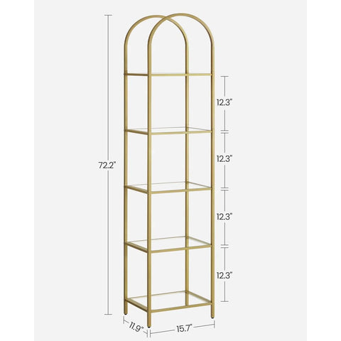 Arched Top Gold Metal Display Rack Narrow Bookcase with 5 Glass Storage Shelves