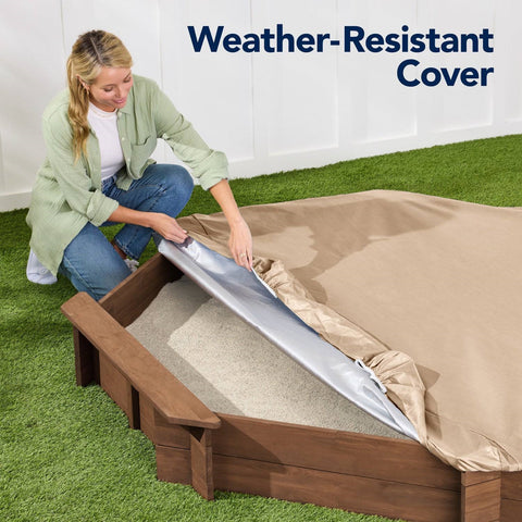 Schools officially out for summer! A uniquely shaped, spacious sandbox provides the perfect venue for children of all ages to meet, play, and explore their imaginations! Each bench comfortably supports up to 220 pounds so parents and children alike can enjoy an afternoon in the sun and sand! Keep your children's play space clear of debris and moisture with a UV- and water-resistant cover An included liner goes under the frame to facilitate drainage and ventilation while discouraging invasive weeds in your child's play space. NOTE: Play-grade sand is sold separately Durable, heat-treated hemlock wood panels are interlocked at the joints for a sturdy assembly that retains its shape and withstands the elements over time