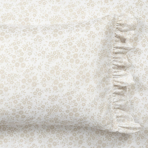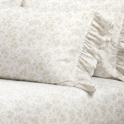 King Size Tan White Floral Ruffle Polyester 6 Piece Sheet Set