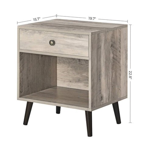 SKU: GRDNSWL76925812This Mid-Century Modern 1-Drawer Nightstand Bedroom End Table in Grey Wood Finish features clean lines and a mid-century modern silhouette, making it a sleek compact space for all your bedroom necessities. It has a solid and engineered wood frame with a rustic brown finish, and it rests on four sleek angled legs that emulate the iconic style. A single drawer gives you a spot for random odds and ends, while a lower cubby is the ideal place for a stack of books. At just under 20" wide, this bedside table also looks nice next to a living room sofa or cushy armchair.
