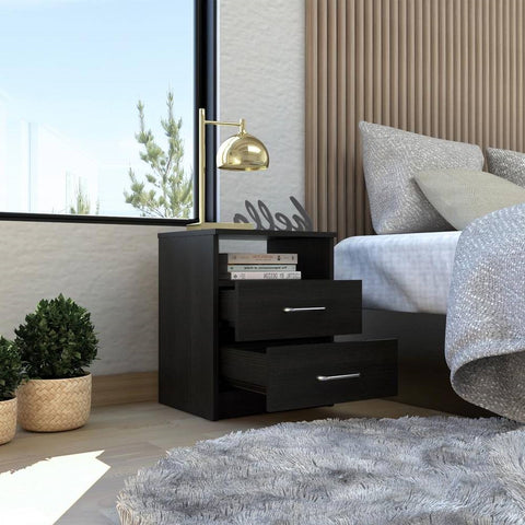 This Modern 2-Drawer Nightstand End Table with Open Shelf in Black Wood Finish features 2 drawers with inner dimensions of 11.9" W x 9.6" D x 3.1" H. Open shelf for ample storage. Spacious top surface for decorative items. Made of durable engineered wood with all-metal railings and pulls. Available in multiple color variations.