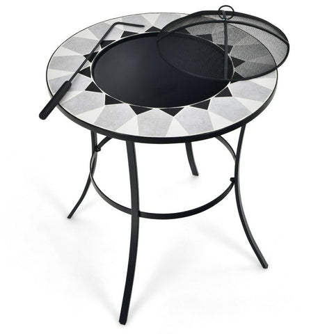 Portable Round Fire Pit Table with Mesh Cover and Fire Poker