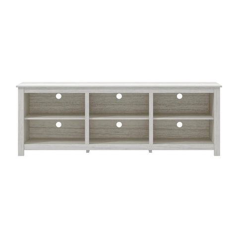 SKU: PWTVSBW17592817This Farmhouse TV Stand in White Wood Grain Finish - for TVs up to 70-inch offers a stylish and practical solution for your living room or den. Designed to accommodate TVs up to 70", it's crafted from engineered wood, offering a range of color options to fit your decor. With six open compartments, you can display your favorite books and decor items while keeping everything organized. The single cabinet with three interior shelves provides additional storage for media devices or games. Plus, the cable management system helps keep your space tidy by corralling those pesky wires. The natural venting ensures your electronics stay cool, making this stand a functional centerpiece for your entertainment area.