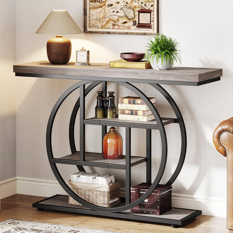 SKU: GRFCTE1395817This Modern 41-inch Wide Narrow Entryway Console Table with Grey Wood Finish Shelves featuring a circular base offers an industrial chic vibe with its rugged design. The grey finish of the table shelves exudes warmth and a vintage feel, while the central two shelves enclosed within a large circular metal frame create an eye-catching centerpiece in any hallway. The 1.57" thick tabletop, firmly held by a metal frame, provides a robust surface that can withstand up to 100 lbs. At dimensions of 11.8"D x 41.3"W x 31.5"H, it provides reliable support. Adjustable leg pads ensure stability on uneven floors, eliminating any wobble concerns. The console table features four staggered tiers providing ample storage and display spaces. From showcasing collectibles to arranging daily essentials, this table effectively merges functionality with aesthetics. This sofa table can seamlessly transition between a console table, tea table, entryway table, or even a TV stand, making it a perfect fit for any space – be it your living room, bedroom, study, or workshop. The accent sofa table's user-friendly design and clear instructions make setup a hassle-free process. Save precious time as you follow the simplified assembly steps and enjoy your new furniture piece in no time.