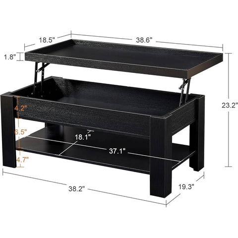 SKU: BVLTCS891743692This Modern Lift Top Coffee Table Laptop Tray with Storage Shelf in Black Wood Finish comes with an adjustable tabletop, allowing you to raise it to a comfortable height. You can easily lift and tilt the tabletop upwards or forwards, creating a functional workspace. This lift coffee table also serves as a lift tabletop dining table or a computer desk with a raised floating surface. Our storage coffee table provides ample storage space in the hidden storage compartments. The tea table top and open shelves offer plenty of space to organize various everyday items such as laptops, remote controls, books, and snacks. This not only maintains a well-organized space but also facilitates easy access to items. This modern coffee table including components, tools, and illustrated assembly instructions simplify the installation process, eliminating tedious steps. Moreover, the tabletop is waterproof, heat-resistant and dust-resistant, requiring only a damp cloth for effortless cleaning. This lift top coffee table with storage makes home maintenance more convenient. This wood coffee table is crafted from easy-to-clean, 15mm wear-resistant MDF, coupled with a sturdy and stable metal frame. The robust structure and premium materials of the wooden coffee table desk ensure the center table will remain stable without wobbling. Wood Living Room Tables dimensions: 38.2"(L) x 19.3"(W) x 17.3-23.2"(H). Tabletop and Storage Shelf load-bearing capacity: 55.1lbs. Compartment load-bearing capacity: 110.2lbs.