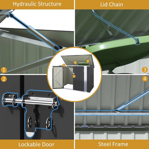 Upgrade your yard with this Outdoor Black Grey Galvanized Steel Garbage Trash Can Storage Shed. Featuring a roomy interior, this tool storage shed is ideal for storing all your large tools and equipment, creating a tidy backyard. The 75 cubic foot capacity enough to store large outdoor items including garbage cans, recycling bins, lawn care tools, and gardening gear. This practical shed is crafted from reinforced steel, helping to fight against rust and UV rays, and is sturdy and durable for many seasons to come. The double sliding door is convenient and space-saving. Also, the two vents help resist moisture, ensuring your tools stay dry in excellent condition. Finally, this shed roof is sloped, the pent roof allows extra storage and prevents rain water from gathering therefore preventing rust.