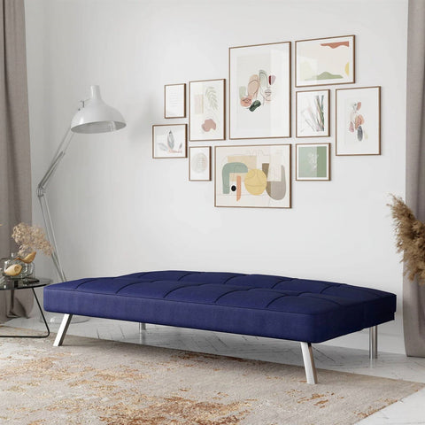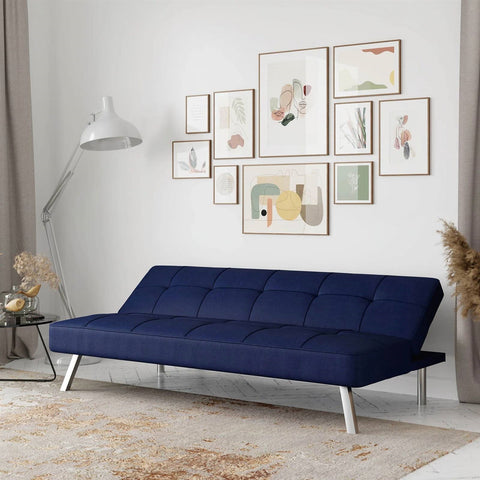 - Modern Futon Sofa Bed in Navy Blue Fabric with Chrome Metal Legs