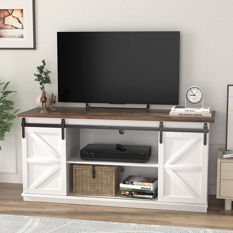 - Farmhouse TV Stand in White Wood Finish with Sliding Doors for TV up to 65-inch